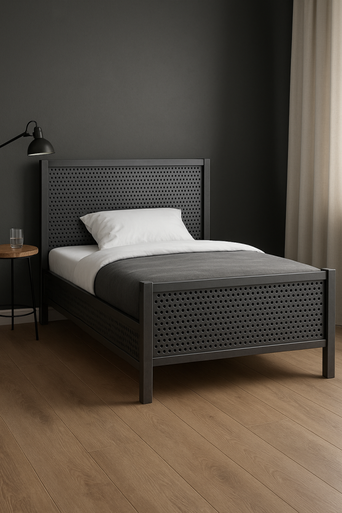 Loftowe łóżko metalowe to propozycja dla osób, które cenią połączenie surowej estetyki z wysoką trwałością. Konstrukcja wykonana została w całości z metalu, co gwarantuje wyjątkową stabilność i odporność na uszkodzenia. To łóżko nie tylko wyróżnia się designem — jego solidność sprawia, że będzie służyć niezawodnie przez wiele lat. Prosta, geometryczna forma oraz czyste linie sprawiają, że łóżko idealnie wpisuje się we współczesne aranżacje loftowe, minimalistyczne i nowoczesne. Opcjonalne elementy z perforowanej blachy dodają całości wyrazistego, industrialnego akcentu, nadając ramie lekkości, a jednocześnie podkreślając jej metalowy charakter.